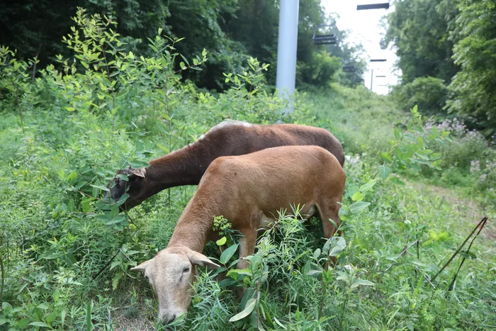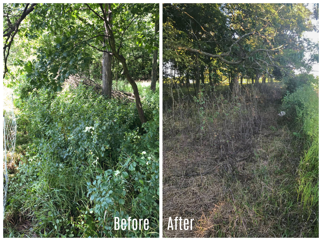 Goats and sheep will eat the leaves and tender, non-woody new growth of stems, but do not eat entire stalks, branches, vines, or roots. They will defoliate nearly all vegetation from about 6-7 feet high and below. They will eat most of the common invasives and unwanted vegetation that we encounter, but there are some things that they can’t or won’t eat.